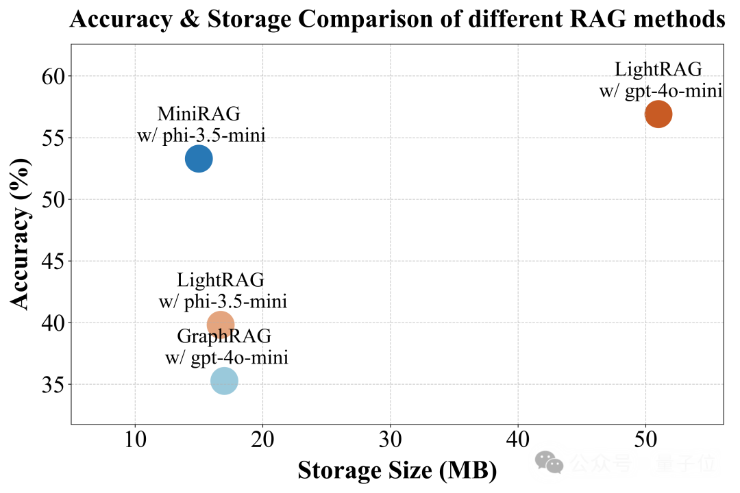 模型的性能评测评估了不同框架在迁移至小模型时的适应能力差异:GraphRAG完全无法保持基本功能,LightRAG的表现锐减近半,而MiniRAG即便在轻量化后依然保持了较高水准,最优情况下性能仅下降不到1%,最差情况也仅降低21%左右。值得关注的是,MiniRAG在显著节省存储空间的同时(仅需原来25%),仍能维持如此稳定的输出质量。