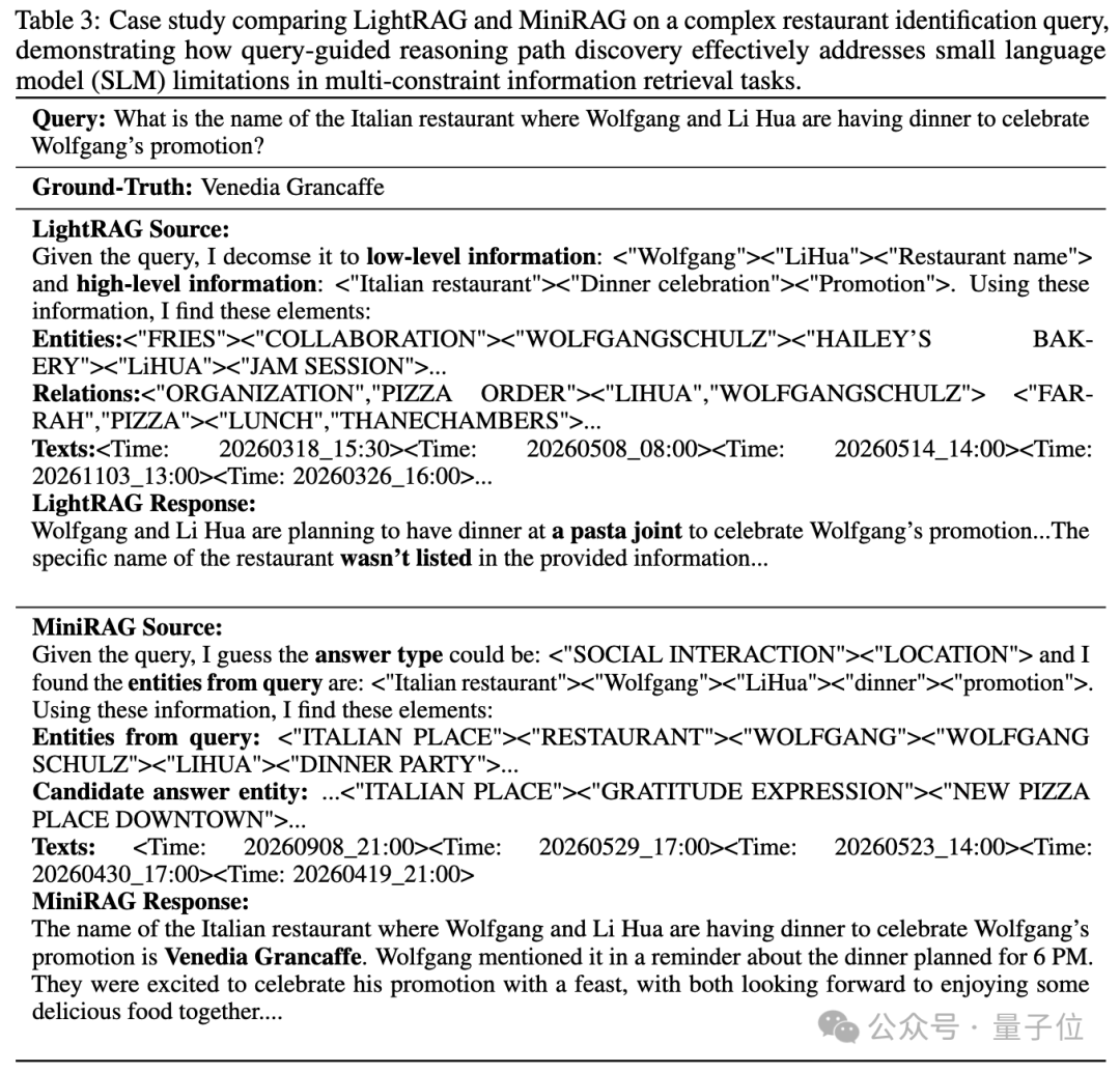研究团队选取了一个具有挑战性的测试案例,查询内容为:Wolfgang和Li Hua为庆祝Wolfgang升职而共进晚餐的那家意大利餐厅叫什么名字?这一查询涉及多重约束条件,要求系统能从在线聊天数据中准确识别特定意大利餐厅及其相关上下文。尽管LightRAG采用了phi-3.5-mini-instruct模型,但受限于小型语言模型的固有局限性,特别是在提取high-level信息和处理图索引噪声方面的不足,导致其检索效果不够理想。