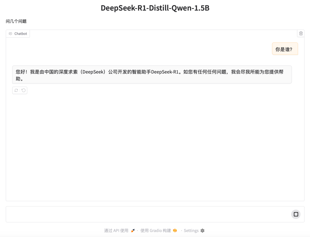 在浏览器中打开链接http://127.0.0.1:7860进入网页交互界面,即可开始使用在OrangePi AIpro(20T)部署的DeepSeek-R1-Distill-Qwen-1.5B模型: