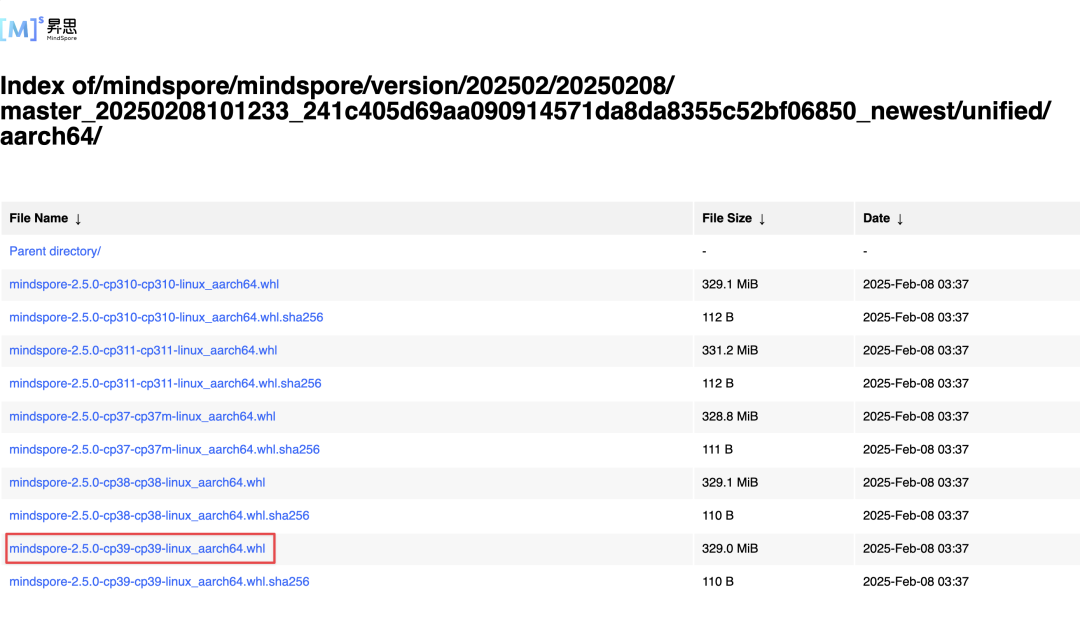 选择对应日期目录后,依次进入master、unified、aarch64目录,选择和香橙派开发板默认的 Python3.9 对应的包即可。