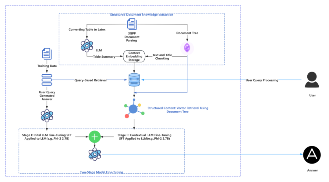 SC-Telco RAG技术在传统RAG的基础上,将文档的结构化信息整合到知识召回的检索过程中,并采用两阶段微调技术增强LLM在通信标准领域中准确回答问题的能力。与传统的RAG相比,SC-Telco RAG采用了一种创新的文档结构化处理方法,根据自然段落和文档标题组织文本,从而创建了一个组织性更强的检索系统,保留了文档的结构和上下文信息。在大模型微调过程中,SC-Telco RAG技术包括两阶段微调,第一阶段微调集中于使大模型适应与通信标准知识问答任务相关的详细指令,而第二阶段则将通过RAG检索到的丰富的上下文信息引入提示中,进一步增强大模型的响应能力和准确性。这种两阶段方法不仅维护了提示中提供的上下文的完整性,而且简化了提示工程的设计难度。