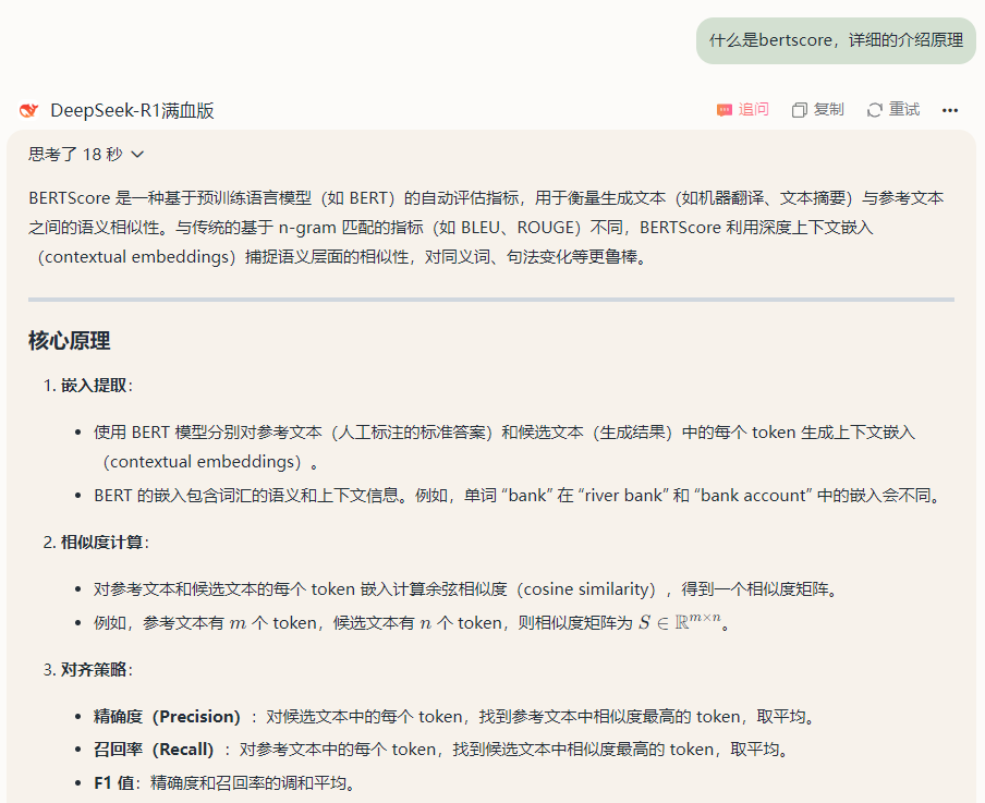 这个时候我们想到了能否通过文本的相似性来评估,可以使用 bertscore 对模型进行比较,那 bertscore 是什么呢?我们来看看 Deepseek 满血版给我的答复,输出的内容太多了,这里就不全部粘贴过来,主体来说就是衡量语意的相似性,那我们似乎可以通过 berscore 来比较训练集的答案和模型生成的答案,来比较直观的看看微调后的模型与原始模型的差异。