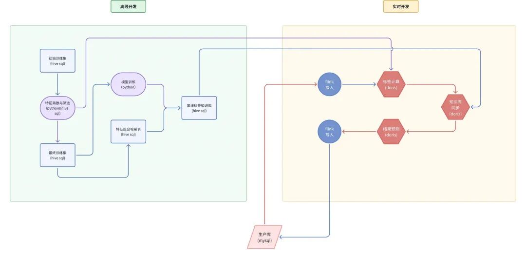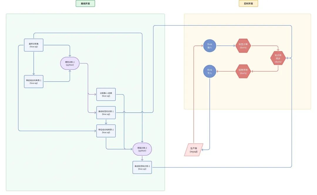 而在实时模块,通过Flink接入生产库数据,Doris 计算获取用户实时标签并对同步到 Doris 中的哈希表进行查询,以实现对目标用户的预测,并最终通过 Flink 回写生产库,或者 Doris 的 API 接口完成整套实时算法服务链路的闭环。