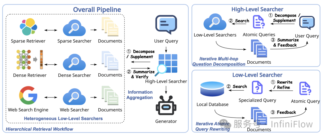 因此,可以看到 Agentic Reasoning 跟 Search o1基本也是同类,只是增加了 Coding Agent 可以执行一些计算任务的思考。 最新一个工作 LevelRAG (参考文献【9】),跟以上几个工作也基本类似,只是称呼不同:执行思考和问题分解的被称作 High-Level Searcher,执行具体搜索的被称作 Low-Level Searcher。放上论文的配图,看起来很好理解,就不多介绍了。
