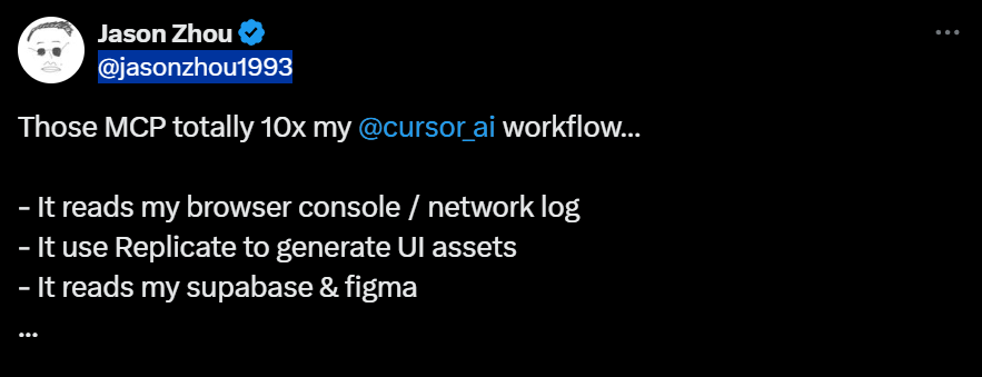 它能读取浏览器控制台和网络日志,用Replicate生成UI资源,连接Supabase数据库和Figma设计。 在Supabase设置了数据库函数,却无法运行。连接Supabase MCP后,Cursor自动排查:找到函数,检查日志,发现问题 —— 变量名大小写不匹配。以往我使用Supbase这样的数据库实际上和Cursor是不好交互的。 有了MCP,Cursor直接与Supbase “ 一起工作 ”。