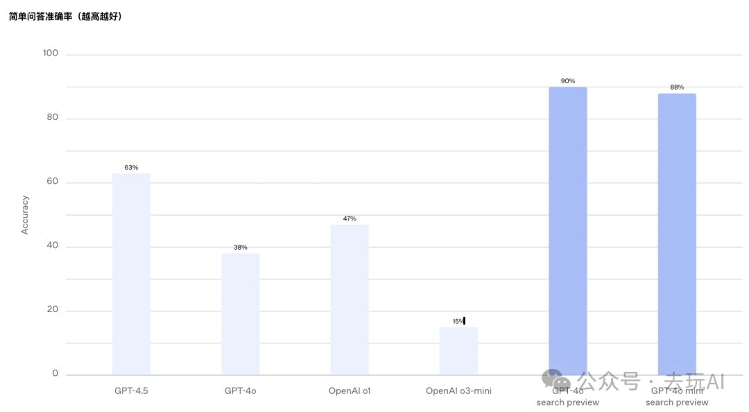 就这么简单?!在SimpleQA基准测试中,GPT-4o搜索和GPT-4o迷你搜索分别得分90%和88%的准确率,这已经高到爆炸了好吗?!