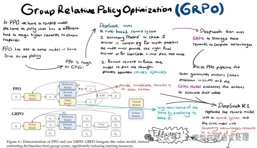 2. GRPO 算法:DeepSeek-R1-Zero 使用 Group Relative Policy Optimization (GRPO) 算法进行训练。GRPO 通过直接估计优势函数来简化 PPO 的实现,从而提高训练效率。