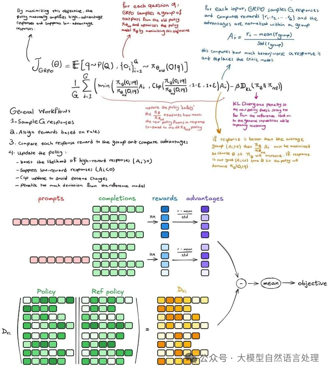 GRPO是一种基于组奖励的策略优化算法,其工作流程可以分为以下几个步骤: