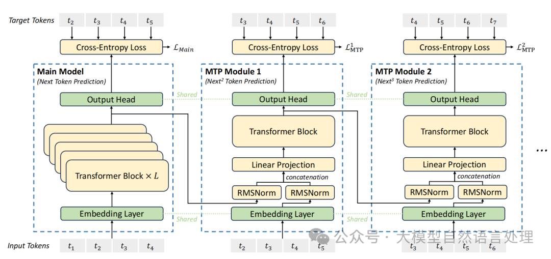 2. 共享嵌入层和输出头:在每个深度的预测中,使用共享的嵌入层和输出头来处理输入和生成输出。这样可以减少模型的参数量并提高计算效率。