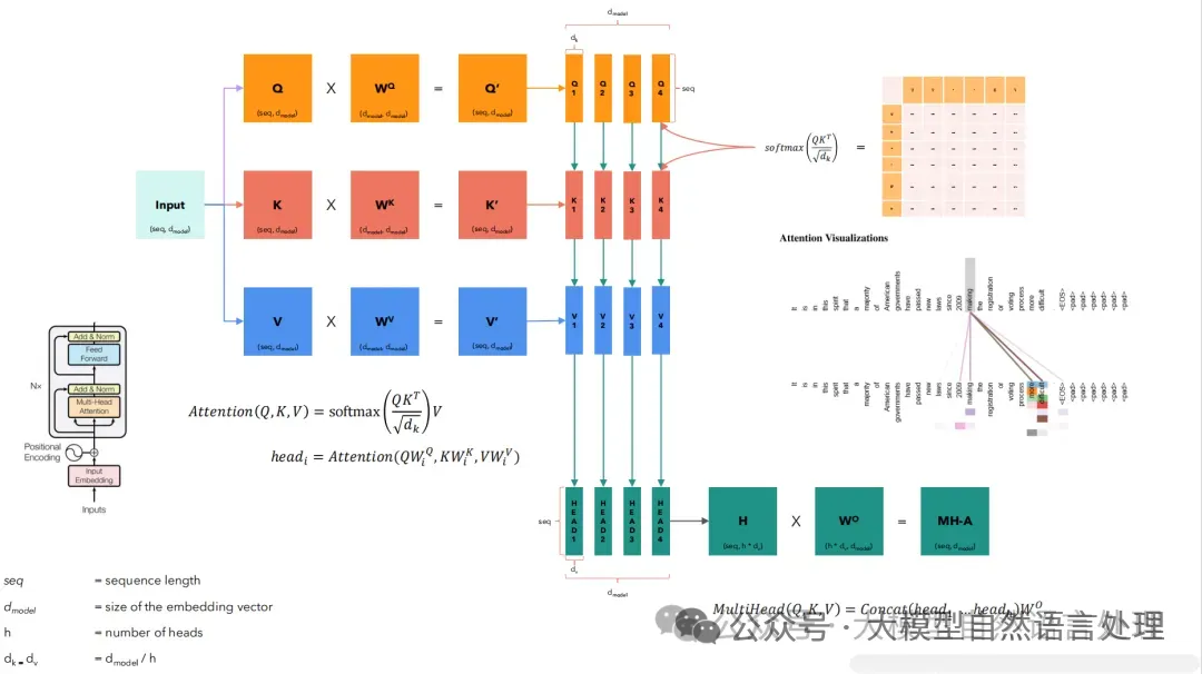 最后,所有头的输出被拼接并通过一个输出投影矩阵进行变换:
