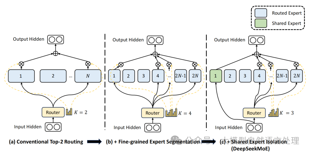 • 如果传统 MoE 中每个 FFN 层有个专家,每个 token 激活个专家。