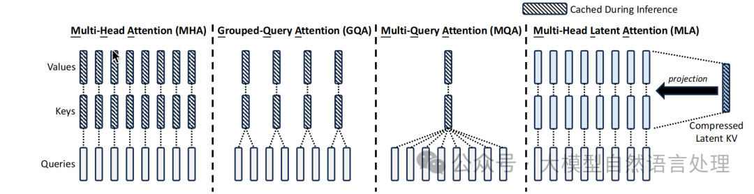 由于,每个token只需要存储的大小为,而不是和的大小,从而大大减少了KV缓存。