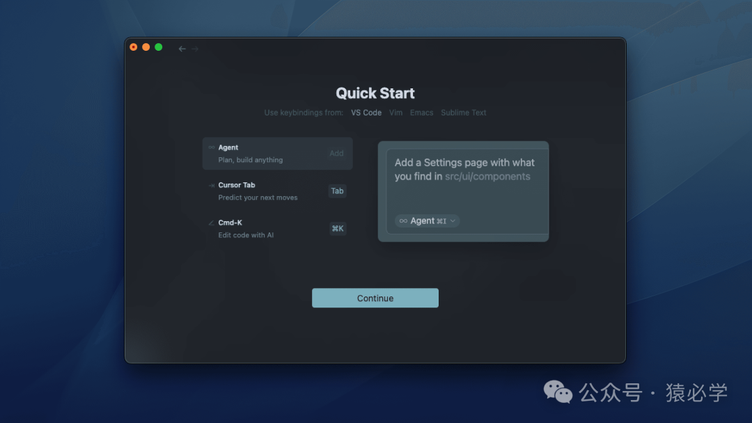 我们引入了一个更简单的入职流程来帮助您开始使用 Cursor。您将被引导通过导入设置,选择主题,键绑定和其他首选项。
