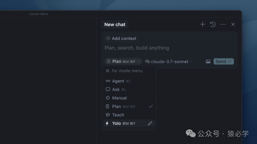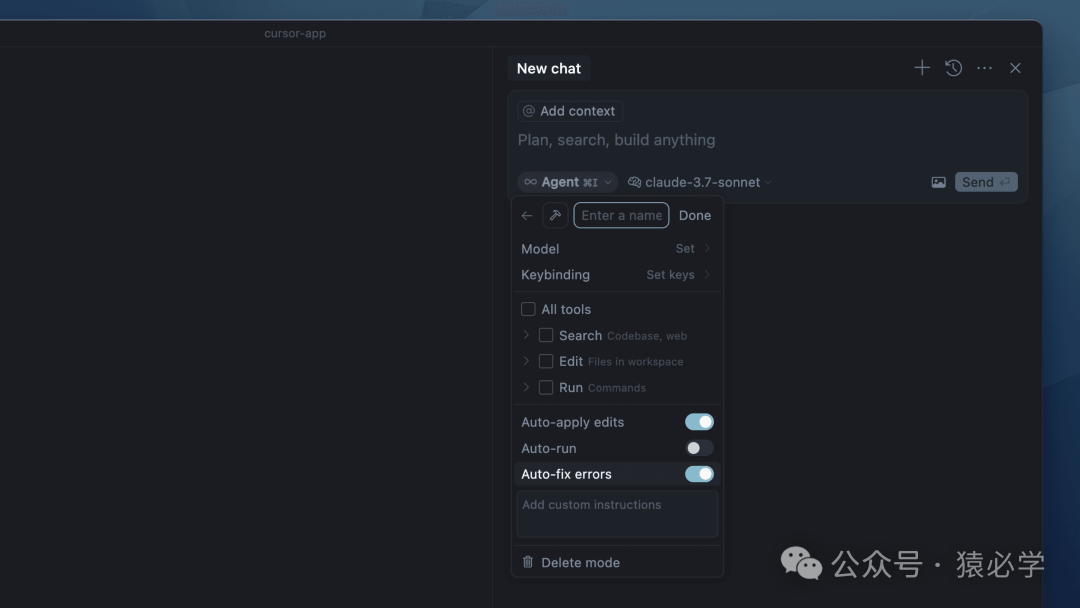 代理和询问模式是 Cursor 中的内置模式,现在可以选择添加自定义模式。我们还将“Edit”重命名为“Manual”,以更好地反映其行为。