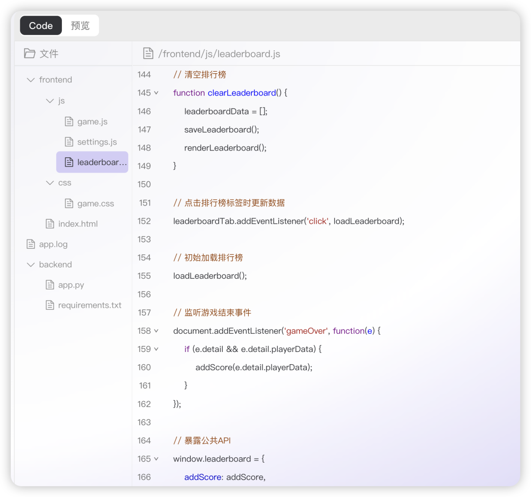 其次从代码生成的结构来看,响指生成的结构会比我手动用 Cursor 生成的单个代码文件更加完善。现在很多可视化网页、单机小游戏的工作流是让模型保证依赖的环境尽可能少的同时,将实现的逻辑都打包进一个代码文件,再复制到Yourwave。