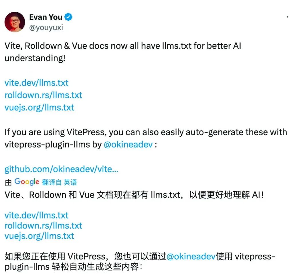 尤雨溪近日宣布,VueViteRollup的文档网站均已添加了llms.txt文件,这一举措旨在让大型语言模型(LLM)更方便地理解这些前端技术。