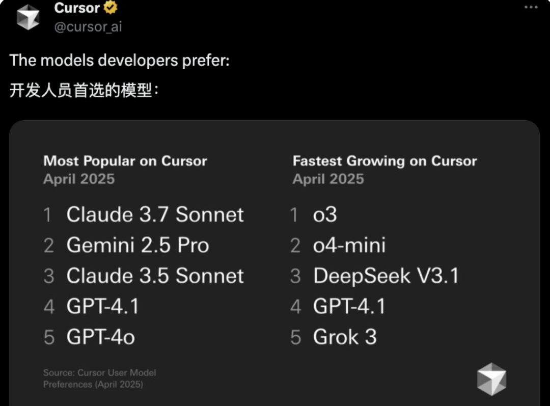 此前根据 Cursor 发布的最受欢迎的 10 大 AI 模型,Gemini 2.5 Pro 上位直接排第 2,接下来要往第一名发起冲刺了!
