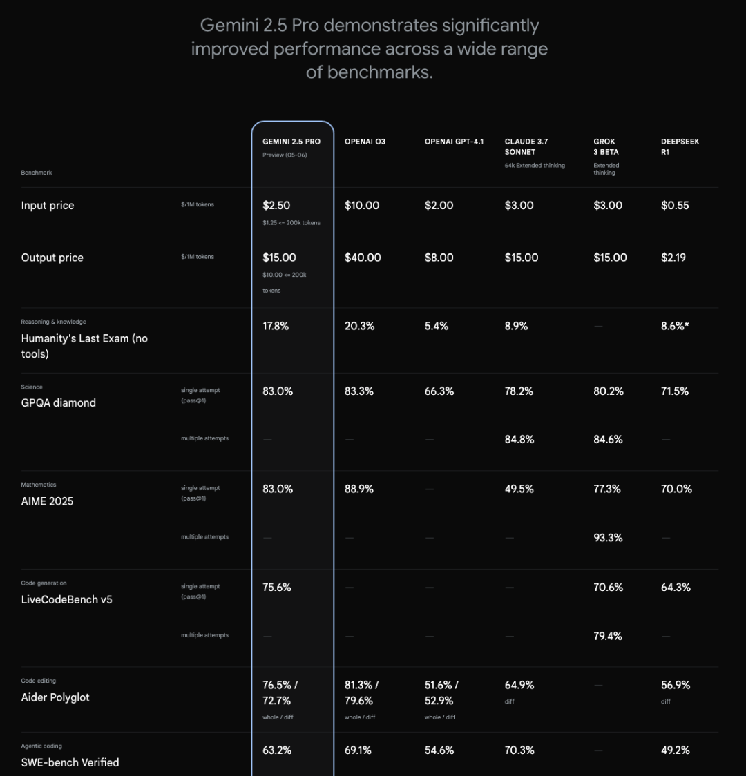 根据谷歌发布的数据,Gemini 2.5 Pro在几乎所有基准测试中都取得了令人印象深刻的成绩: