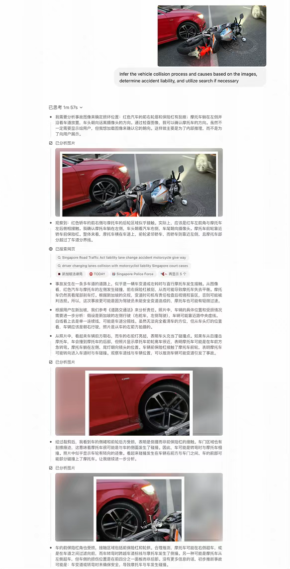 OpenAI o3强在哪里?跟这些R1-VL模型的区别在哪? o3其实是一个智能体,它可以自主的调用各种工具,来完成任务。 边看图边思考,图像不仅仅是第一轮的时候才会输入,中间会产生中间图片,继续作为信息输入到VL模型中。 下图为部分思考示例: