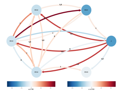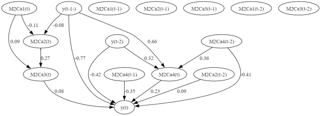图1:筛选后的因子列表 本课题提出了基于信息转移熵的因果分析方法,该方法可以离散计算量化因子的有效转移熵,并用有效转移熵来度量量化因子对目标变量的因果强度,具有非常强的创新性,已申请1个国家发明专利,课题用沪深300指数为例,证明了基于信息转移熵的因果分析方法的有效性。 本课题提出了基于因果AI的黄金价格因果结构图。深入研究因果发现算法,构建了黄金价格因果结构图,建立因子与黄金之间的因果逻辑关系:因果方向,因果强度和时间滞后。