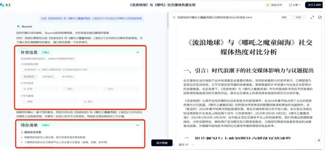 实现方式:每一步出llm结果,人工编辑确认执行。对于用户不清楚的问题,llm以多轮追问的方式进行引导->用户确认,迭代至意图信息完整,然后再最终生成结果,例如如下天工智能体的人工接入补充信息的中间过程: