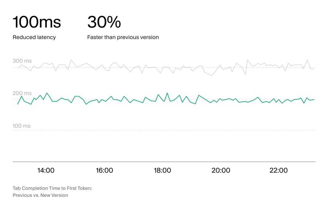 Cursor 团队显然明白这一点。他们在 1.2 版本中优化了 Tab 键的代码补全性能。现在,Tab 补全的速度提升了大约 100 毫秒。从按下按键到看到建议的"首次响应时间"也减少了 30%。