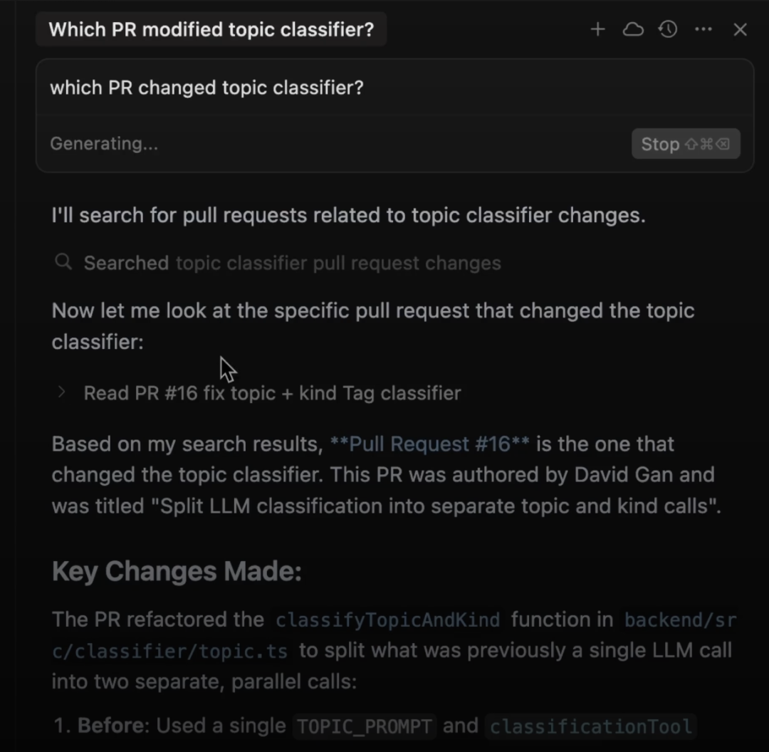 比如,你可以问:"which PR changed topic classifier?" Cursor 就会把相关的 PR 找出来。你甚至可以搜索具体的 issue、commit 或者分支。Cursor 还会把 PR 里的评论和讨论都包含进来。