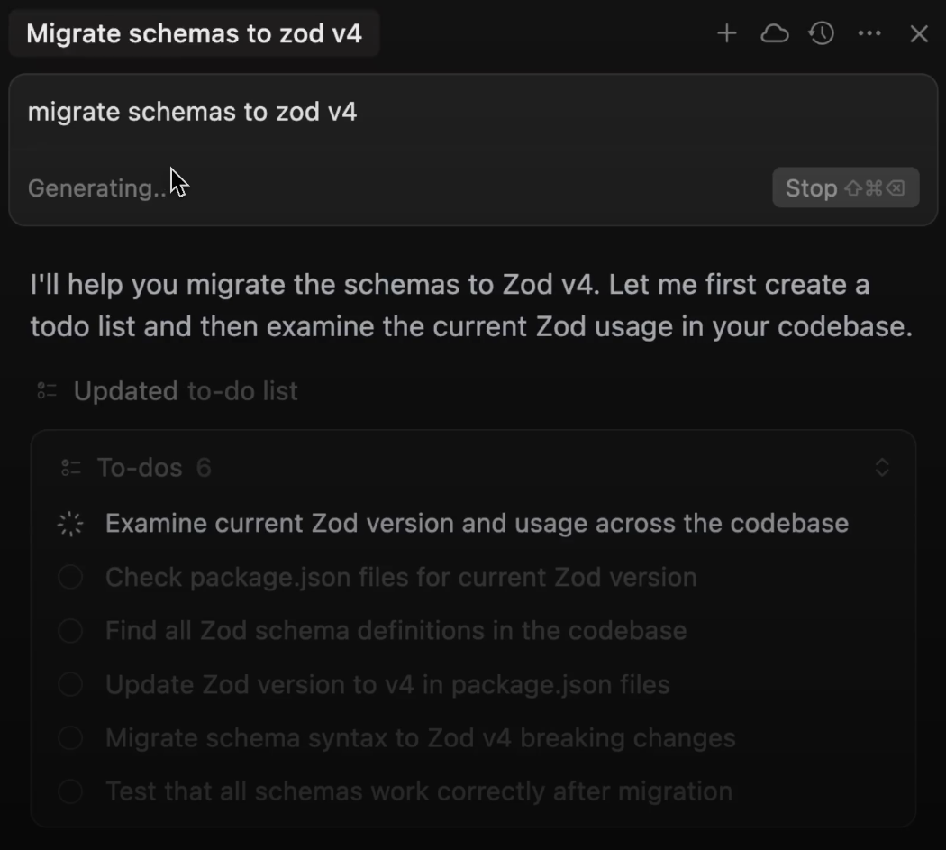你给 Cursor Agent 一个比较大的开发任务。Agent 不会直接开始闷头写代码,它会先思考。然后,它会把这个大任务分解成一个个具体的小步骤。
