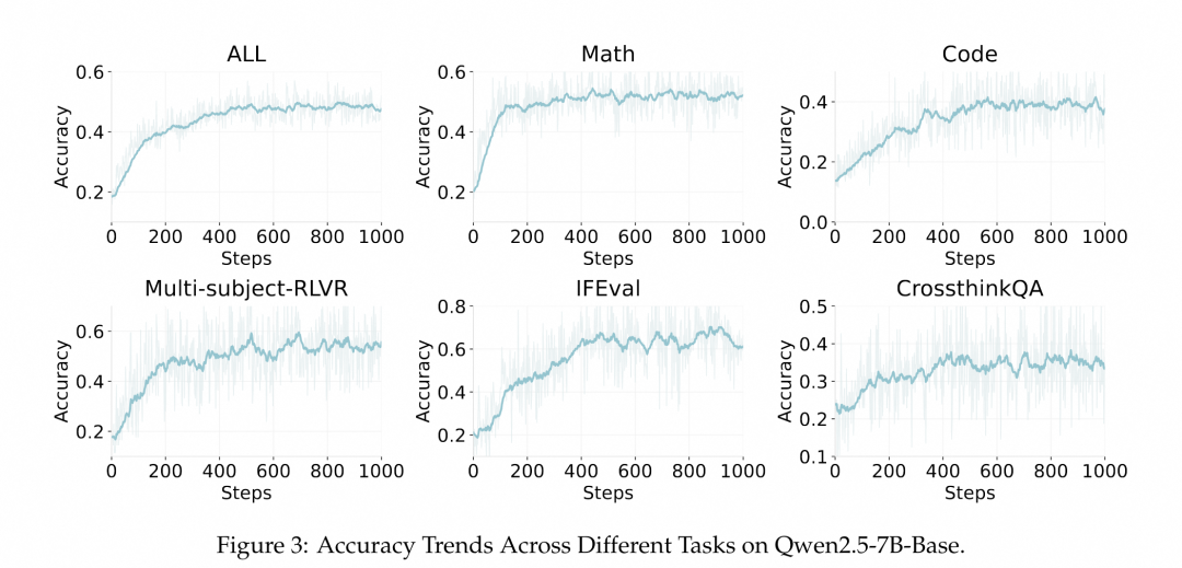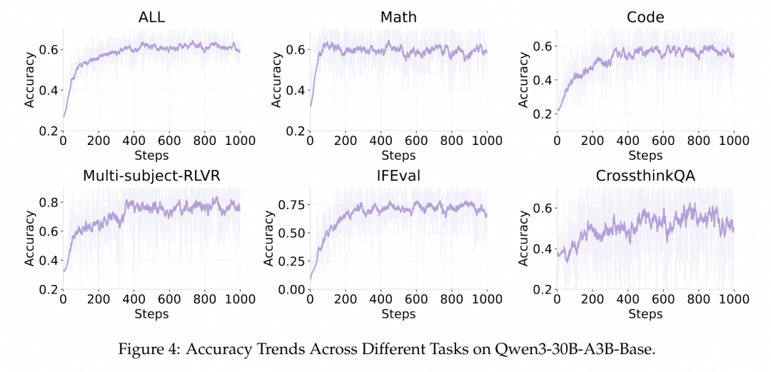 图 4a 展示了 Qwen3-30B-A3B-Base 模型在不同任务上的性能变化。该模型的总体准确率由 0.27 提升至 0.62,提升了约 2.3 倍。尽管 Qwen3-30B-A3B-Base 采用了 Mixture-of-Experts 架构,在训练过程中表现出更大的波动性,但其整体趋势依然明显上升,并最终达到了更优的性能表现。