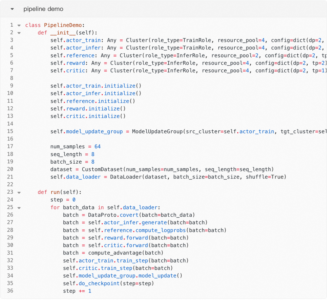 pipeline描述RL计算流,编排各个角色的计算流程,是算法同学直接DIY的地方,包括各模型的分布式计算调用、数据处理、reward处理、adv计算等等。