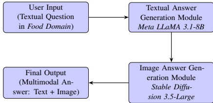 最终的多模态知识图谱包括: 表1:多模态知识图谱的汇总统计。 更多实施细节——包括数据预处理规则、用于标准化的LLM提示设计、多线程图片抓取以及RDF模式——在附录A中提供。 3.2 问题-答案数据集生成我们通过一个平衡精确性和多样性的混合流程生成高质量问答数据集。 3.2.1 基于模板的问答生成我们设计了40个结构化模板,涵盖:食材识别、营养价值、替代品、烹饪方法和视觉菜肴识别。模板源自MMKG实体-关系对,确保事实一致性和领域覆盖。 3.2.2 基于大型语言模型的问答增强为了注入语言多样性与多模态推理,我们使用: ● LLaVA:利用MMKG关联的图片生成视觉-语言问答(例如,“这道菜叫什么名字?”)。 ● DeepSeek:对模板问题进行释义和扩展(例如,“我可以在这个食谱中用葱替代吗?”),增强对话深度。 3.2.3 数据集增强与精炼后处理确保质量和平衡: ● 去重:移除冗余的问答对。 ● 语义聚类:使用TF-IDF和SBERT嵌入均匀分布问题类型。 ● 手动策展:过滤掉虚假或无关的问答。 这种混合方法产生了一个多样化、语义丰富且事实准确的问答数据集,为后续多样性分析和模型评估奠定了基础。附录B详细解释了食材标准化和数据集创建的方法论。 4 方法论我们的多模态食物问答框架有两个主要阶段:(1)统一的文本和图片答案生成,(2)对事实准确性的图片幻觉检测。 4.1 统一文本-图片生成架构对于像“鸡肉汉堡的成分是什么?”这样的食物问题,Meta LLaMA 3.1-8B会生成一个结构化的文本答案,而Stable Diffusion 3.5-Large则从相同的提示中创建一个说明性的图片。在2000个对齐的问答-图片对上进行联合微调,可以将BERT分数提高16.2%,将FID降低37.8%,并将CLIP相似度提高31.1%,从而提升文本-图片联合成功率38.9%(见第5节)。 图1展示了流程:用户查询进入文本模型,其输出会指导图片模型,产生一个连贯的多模态响应。 该系统集成了: ● Meta LLaMA 3.1-8B用于文本生成 ● Stable Diffusion 3.5-Large用于图片合成