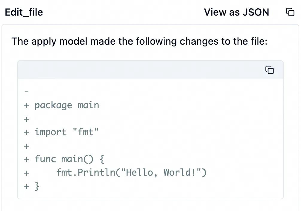 收到这些信息后,大模型开始干活了。它调用edit_file工具修改代码,其参数如下表。 edit_file工具调用另一个小模型在本地修改hello.go。更准确地说是创建ingFang SC", system-ui, -apple-system, BlinkMacSystemFont, "Helvetica Neue", "Hiragino Sans GB", "Microsoft YaHei UI", "Microsoft YaHei", Arial, sans-serif;letter-spacing: 0.034em;font-style: normal;font-weight: normal;">hello.go,因为我们现在还没有任何代码。ingFang SC", system-ui, -apple-system, BlinkMacSystemFont, "Helvetica Neue", "Hiragino Sans GB", "Microsoft YaHei UI", "Microsoft YaHei", Arial, sans-serif;letter-spacing: 0.034em;font-style: normal;font-weight: normal;">edit_file返回如下结果给大模型。