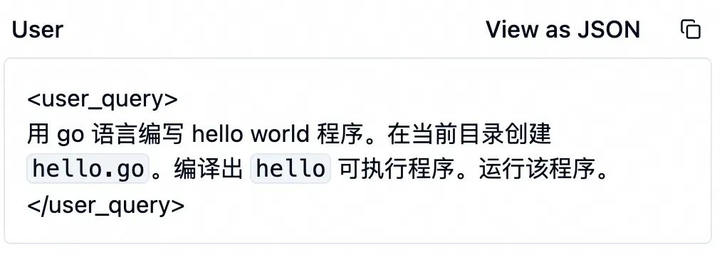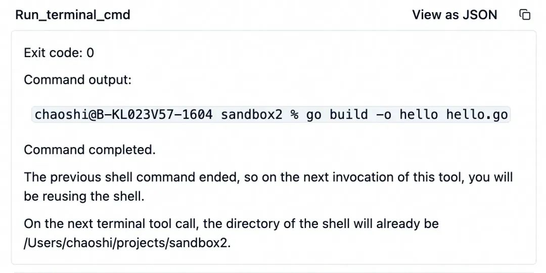 编辑代码完成后,大模型继续调用工具编译和运行这个程序。本次使用工具run_terminal_cmd运行ingFang SC", system-ui, -apple-system, BlinkMacSystemFont, "Helvetica Neue", "Hiragino Sans GB", "Microsoft YaHei UI", "Microsoft YaHei", Arial, sans-serif;letter-spacing: 0.034em;font-style: normal;font-weight: normal;">go build ...。顾名思义,这个工具在本地指定的终端命令。这个命令运行成功了,在本地生成了ingFang SC", system-ui, -apple-system, BlinkMacSystemFont, "Helvetica Neue", "Hiragino Sans GB", "Microsoft YaHei UI", "Microsoft YaHei", Arial, sans-serif;letter-spacing: 0.034em;font-style: normal;font-weight: normal;">hello可执行程序。
