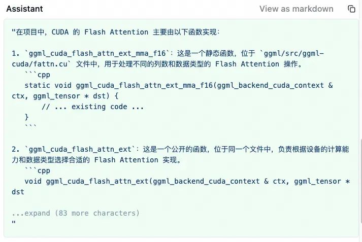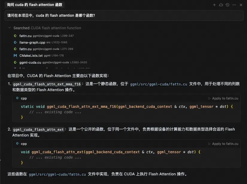 大模型在处理提示词后,调用了codebase_search工具,搜索的关键词是“CUDA flash attention function”。ingFang SC", system-ui, -apple-system, BlinkMacSystemFont, "Helvetica Neue", "Hiragino Sans GB", "Microsoft YaHei UI", "Microsoft YaHei", Arial, sans-serif;letter-spacing: 0.034em;font-style: normal;font-weight: normal;">codebase_search工具返回了 17 条结果。 ggml/src/ggml-cuda/fattn.cusrc/llama-graph.cppggml/CMakeLists.txtggml/src/ggml-cuda/ggml-cuda.cuggml/src/ggml-cuda/fattn-common.cuhggml/src/ggml-cuda/fattn-mma-f16.cuhggml/src/ggml-cuda/fattn-tile-f32.cuggml/src/ggml-cuda/fattn-vec-f32.cuhggml/src/ggml-vulkan/ggml-vulkan.cppggml/src/ggml.cggml/src/ggml-cuda/common.cuhggml/src/ggml-cuda/fattn-vec-f16.cuhggml/src/ggml-cuda/fattn-tile-f16.cutools/mtmd/clip.cppggml/src/ggml-cpu/ggml-cpu.cggml/src/ggml-cann/ggml-cann.cppinclude/llama.h 实际中的每条结果还包含代码片段,这里为简洁起见不展示出来。 我们可以看到,并非每条结果都是相关的。例如CMakeLists.txt完全无关,而ingFang SC", system-ui, -apple-system, BlinkMacSystemFont, "Helvetica Neue", "Hiragino Sans GB", "Microsoft YaHei UI", "Microsoft YaHei", Arial, sans-serif;letter-spacing: 0.034em;font-style: normal;font-weight: normal;">ggml-cpu.c、ingFang SC", system-ui, -apple-system, BlinkMacSystemFont, "Helvetica Neue", "Hiragino Sans GB", "Microsoft YaHei UI", "Microsoft YaHei", Arial, sans-serif;letter-spacing: 0.034em;font-style: normal;font-weight: normal;">ggml-vulkan.cpp、ingFang SC", system-ui, -apple-system, BlinkMacSystemFont, "Helvetica Neue", "Hiragino Sans GB", "Microsoft YaHei UI", "Microsoft YaHei", Arial, sans-serif;letter-spacing: 0.034em;font-style: normal;font-weight: normal;">ggml-cann.cpp尽管也是注意力的计算代码,但却不是我们想要的 cuda 的实现。 大模型阅读上述检索结果后,产生最终的输出给用户。