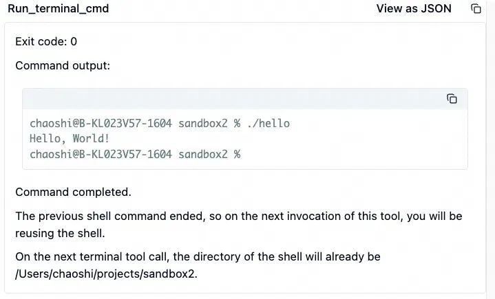 然后,大模型继续调用run_terminal_cmd工具,运行方才生成的ingFang SC", system-ui, -apple-system, BlinkMacSystemFont, "Helvetica Neue", "Hiragino Sans GB", "Microsoft YaHei UI", "Microsoft YaHei", Arial, sans-serif;letter-spacing: 0.034em;font-style: normal;font-weight: normal;">hello程序。如预期,这个程序输出了ingFang SC", system-ui, -apple-system, BlinkMacSystemFont, "Helvetica Neue", "Hiragino Sans GB", "Microsoft YaHei UI", "Microsoft YaHei", Arial, sans-serif;letter-spacing: 0.034em;font-style: normal;font-weight: normal;">Hello World!字符串。
