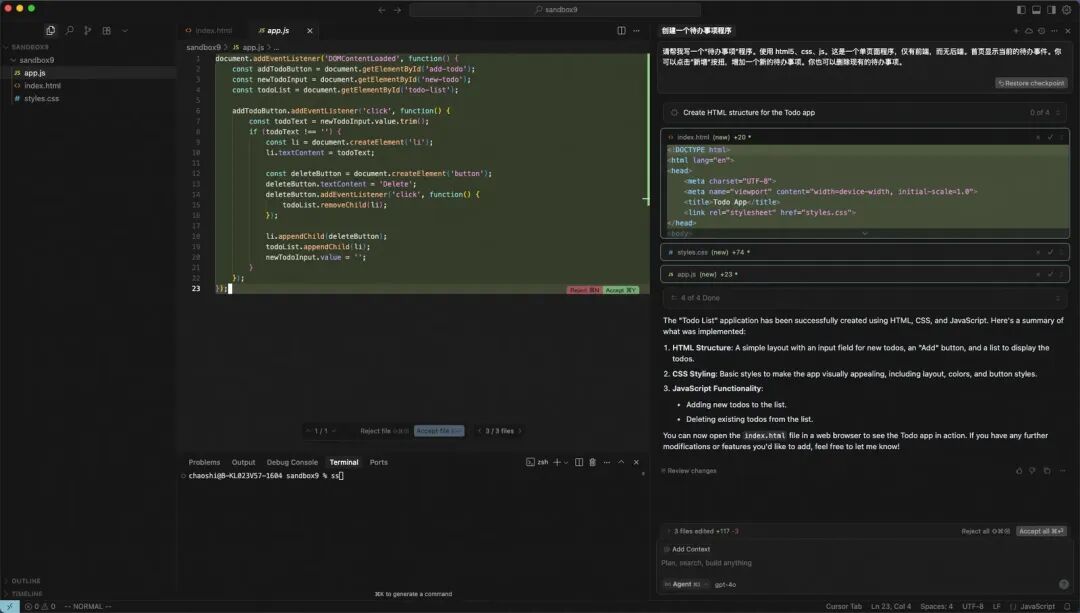 大模型调用todo_write工具创建了工作项: 随后,依次调用edit_file工具生成index.html、style.css、app.js。 最后再次调用todo_write将上述工作项全部标记为完成。 这个程序的运行效果如下: