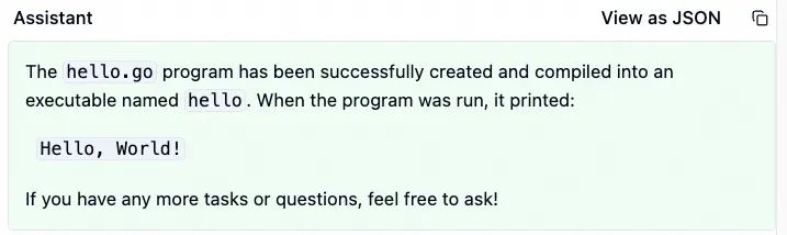 当hello运行结果回传后,大模型认为所有工作都完成了,它给出了总结。