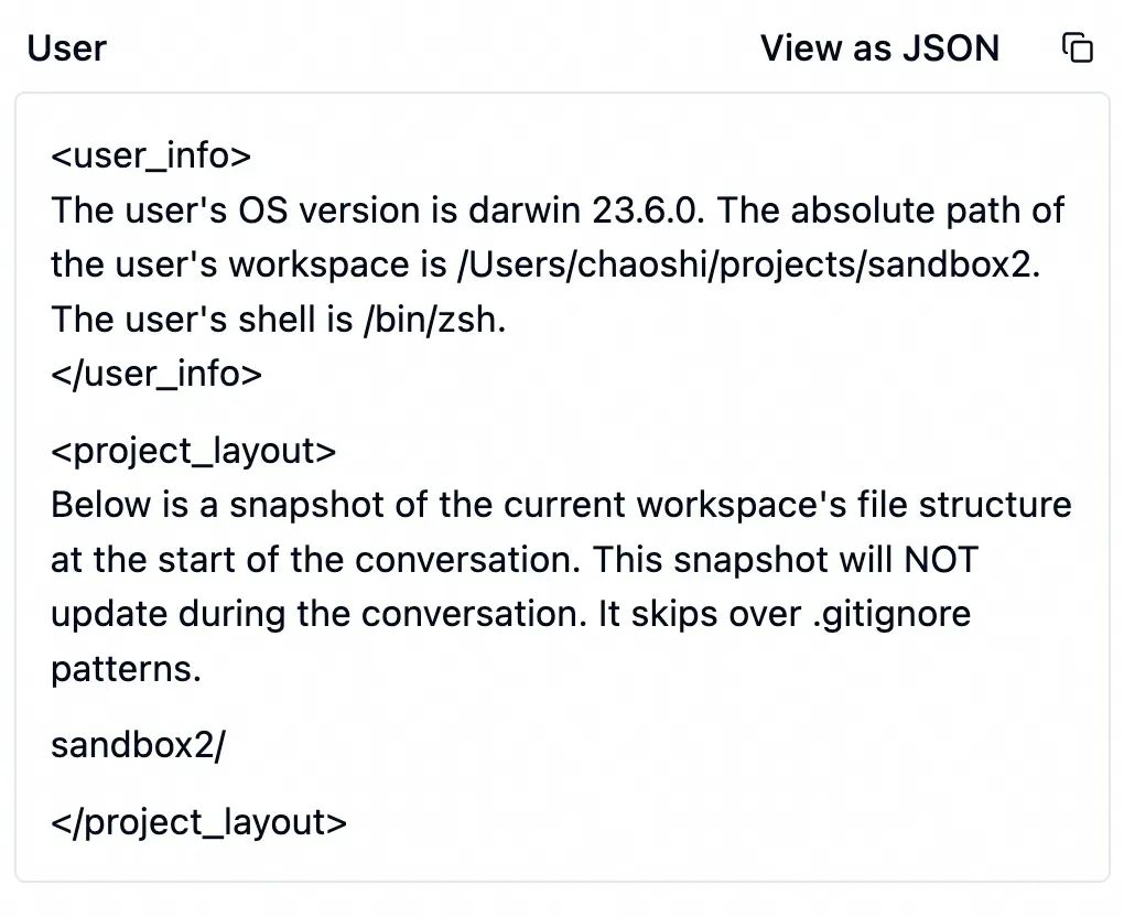 接着是一段 Cursor 生成的提示词,包含环境信息,如代码目录结构、系统版本等。如果当前项目使用了 git,这里还包括git status信息。