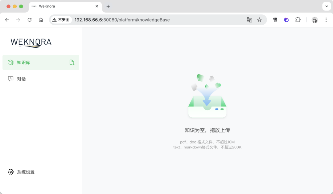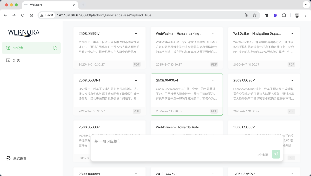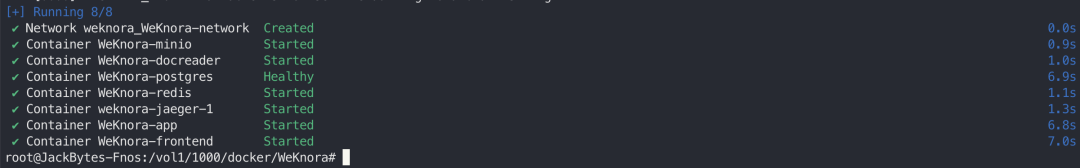 中间如果遇到postgres的端口问题,可以在.env中修改postgres的端口。 如果遇到 80 端口的问题,可以在docker-compose.yml中修改80 端口为其他的:  如果出现下面的内容,则表示启动成功:  与此同时,可以在飞牛 OS 的 Docker 管理界面看到运行着的项目:  至此,WeKnora就搭建好了,下面我们一起来体验一下。 四、体验在浏览器输入http://IP ort,其中 IP 是飞牛 OS 的 IP,Port 是上面修改的 30080 端口,比如我的是:http://192.168.66.6:30080:  在进入首页之后,首先会让设置一些信息,比如:大模型配置、Embedding 模型配置、Rerank 模型配置、多模态配置、文档分割配置。 其中大模型配置可以实用本地的 Ollama 模型,或者远程的大模型:  Embedding 模型也是,可以选择用本地或者远程的:  设置好之后,保存进入主页面:  上传几个文档看看,可以看到知识库自动分析了文档的内容,并进行了总结:  下面提问下看看:  可以看到知识库参考了一些文档内容,并进行了总结回答:  好了,今天的介绍就到这里了,大家感兴趣的话快去试试吧! 五、总结WeKnora 作为一款基于大模型的文档理解检索框架,凭借其精准的文档理解能力、智能的推理功能、灵活的扩展特性、高效的检索机制以及简单易用和安全可控等优势,在企业知识管理、科研文献分析、产品技术支持、法律合规审查、医疗知识辅助等众多场景中都能发挥重要作用。 |