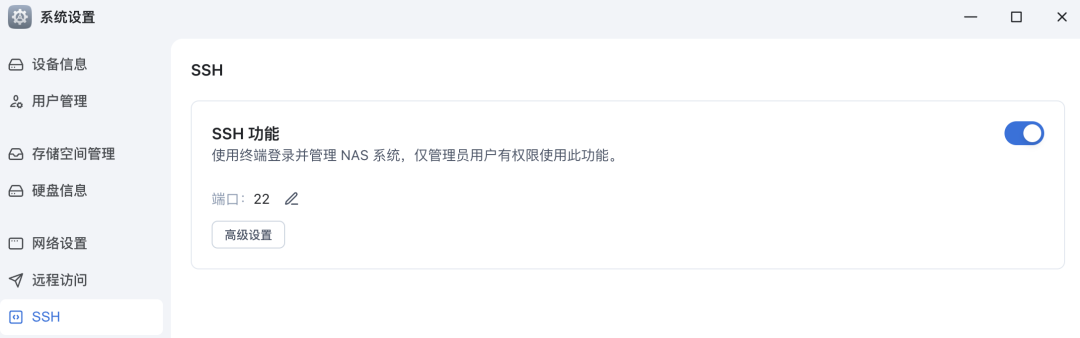 三、在飞牛 NAS 上部署本文教大家怎么在飞牛 NAS 上部署,主要是通过 Docker 进行部署,理论上在其他支持 Docker 的设备上也可以部署。 首先打开飞牛的SSH 登录功能:  执行下面的命令切换到root账户: sudo -i