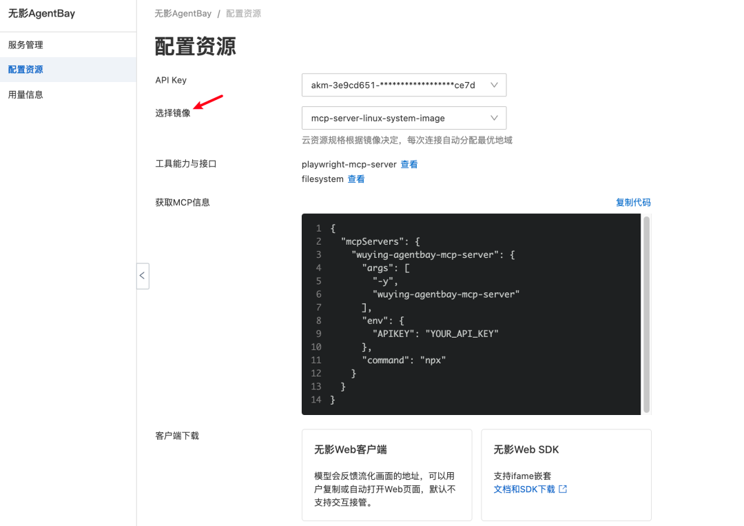 在配置资源选择镜像。你可以在当前页面看到本地 MCP 服务的信息,复制后续备用。