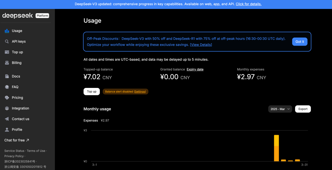 • 去 DeepSeek API 平台 https://platform.deepseek.com/usage 申请一个 API Key,现在官方的服务器已经可以稳定使用了。