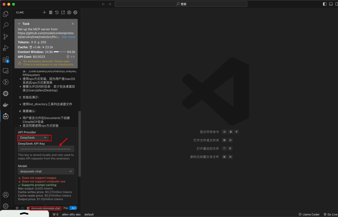 • 在 VS Code 里选择deepseek-chat,输入你在上文中申请的 Key。当然你也可以使用deepseek-r1,我只是嫌它每次使用工具还要思考一遍,太内耗太慢了。