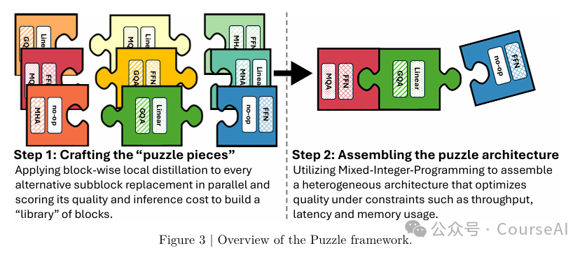 在构建了替代块库之后,Puzzle 框架利用混合整数规划求解器根据给定约束选择每层的最优块。 例如,对于 LN-Super 模型,约束条件包括在单个 NVIDIA H100 GPU 上实现至少 5 倍的吞吐量提升,并且在 FP8 精度下支持约 300K 缓存标记。 通过 MIP 求解器根据给定约束(如硬件兼容性、最大允许延迟、总内存预算或期望推理吞吐量)从块库中选择每层的最优块,构建完整的模型。 MIP 求解器通过优化目标函数,在满足约束条件的前提下,从块库中选择最优的块组合,构建完整的模型。 例如,对于 LN-Ultra 模型,最终模型在 8 个 H100 GPU 上实现了至少 1.5 倍的延迟降低,并且在 FP8 精度下支持高达 3M 缓存标记。