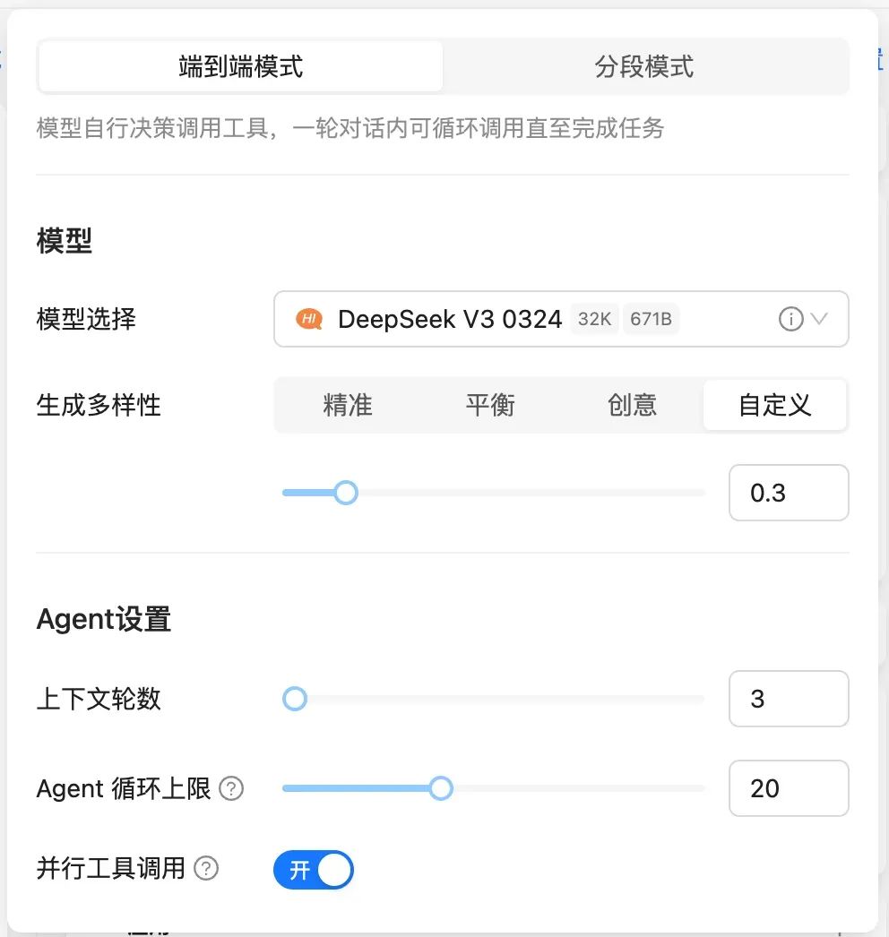 生成多样性参数建议配置为0.3 请使用端到端模式,在该模式下,用户输入 query 之后,系统会循环调用模型,由模型决策使用工具或者直接回复。在以下两种情况会停止循环: 1.模型不再调用工具,而是直接回复; 2.模型调用次数(不是工具调用次数)达到设置的上限。 端到端的循环模式
