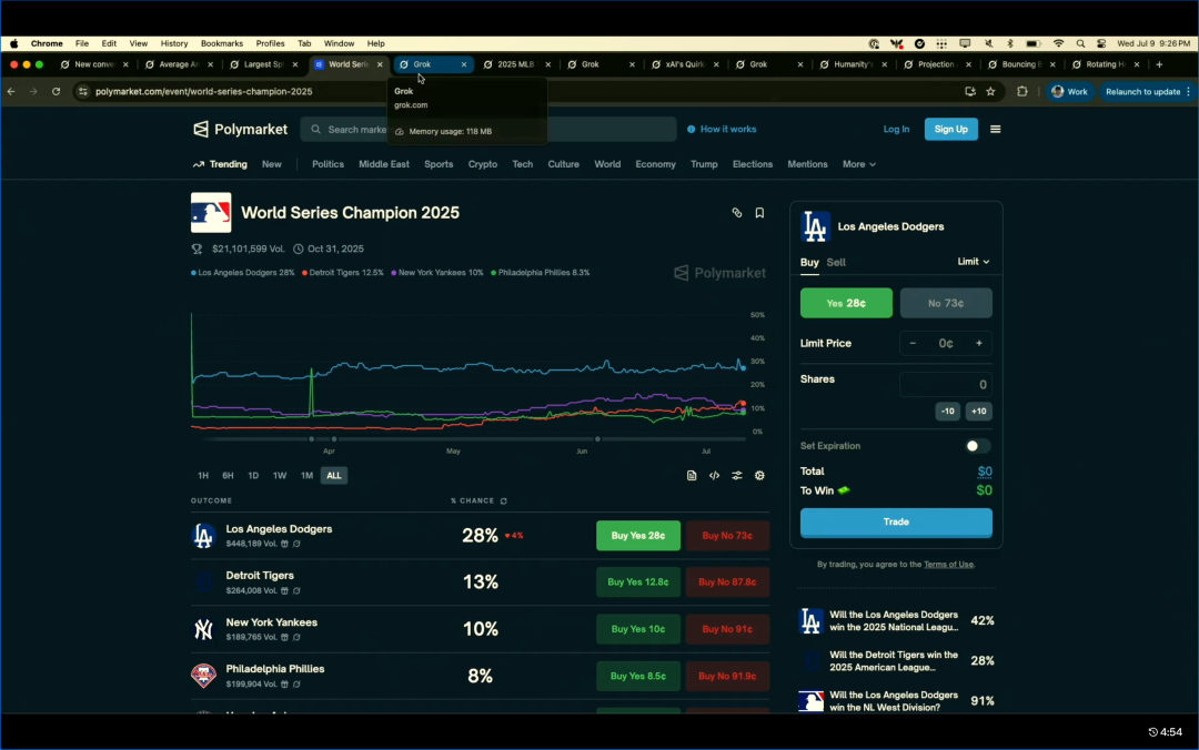 在预测平台 Polymarket 上分析 2025 年 MLB 世界大赛冠军,Grok 4 不仅浏览了赔率,还结合 FanGraphs 的数据计算出自己的概率,识别出市场赔率与实际概率之间的差异,找到了“Alpha”和“Edge”