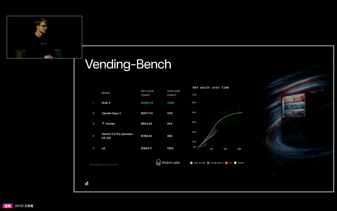 结果显示,Grok 4 的表现远超其他前沿模型,其创造的净值是第二名(Claude Opus 4)的两倍以上,展现了其在复杂、长周期任务中的战略规划和执行能力。