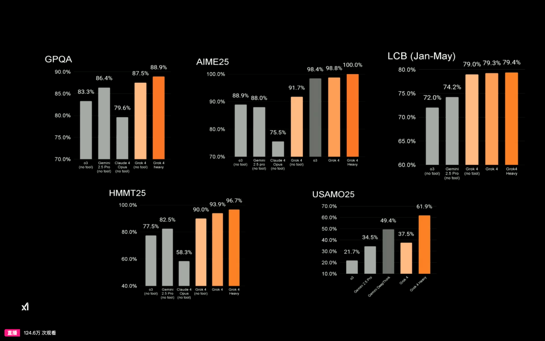 据称,没有任何人类能在所有领域达到博士后水平,但 Grok 4 实现了这一点。图表结果显示,Grok 4 及 Grok 4 Heavy 在 GPQA、AIME25、HMMT 等多个顶级基准测试中,表现全面超越所有竞争对手,包括 Claude Opus 4 与 Gemini 2.5 Pro。