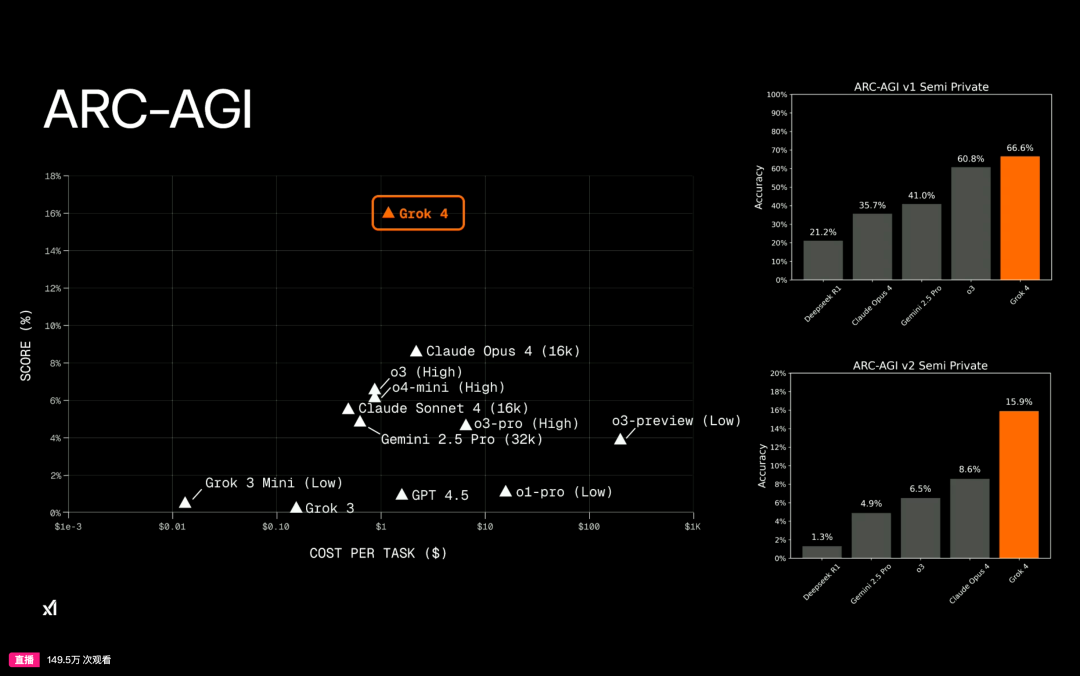 在 ARC-AGI (之前奥特曼介绍的)榜单中,Grok 4 在 v1 中超过 o3,在 v2 中两倍于 o3。(注意,比不上 o3-pro)