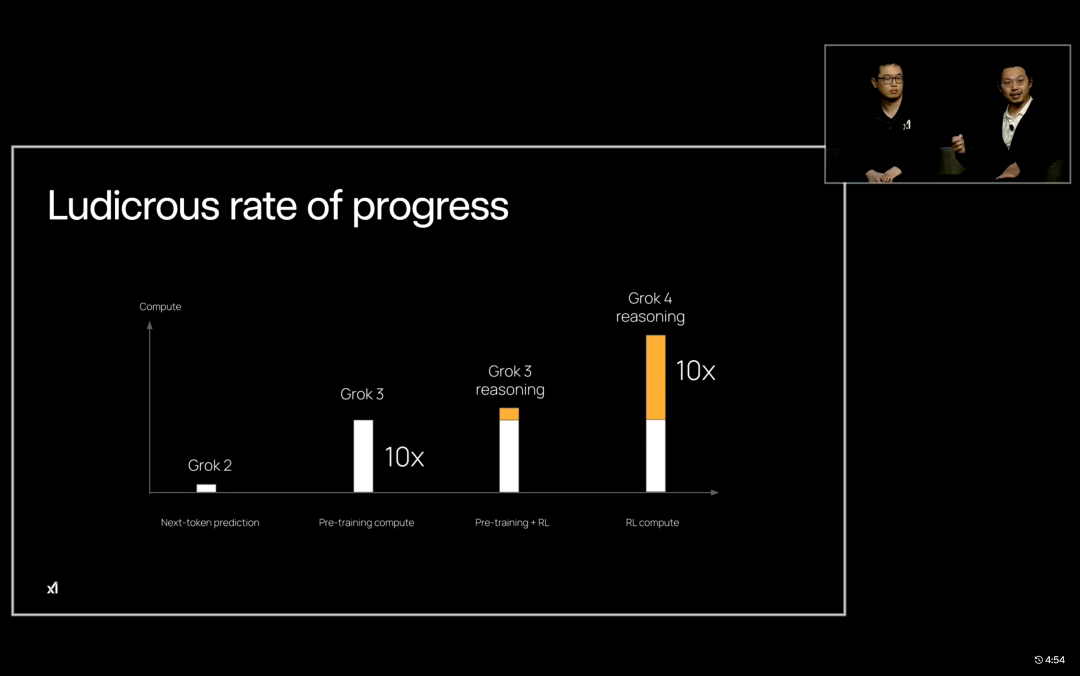 马斯克表示:Grok 系列展现出“荒谬的进步速度”(Ludicrous rate of progress)。从 Grok 2 到 Grok 4,每一代模型的训练计算量增加约 10 倍,总增幅达 100 倍。